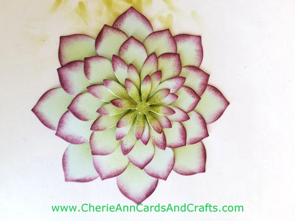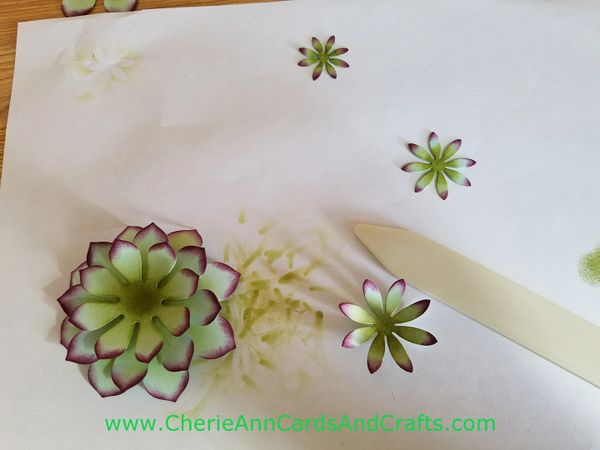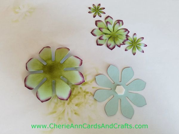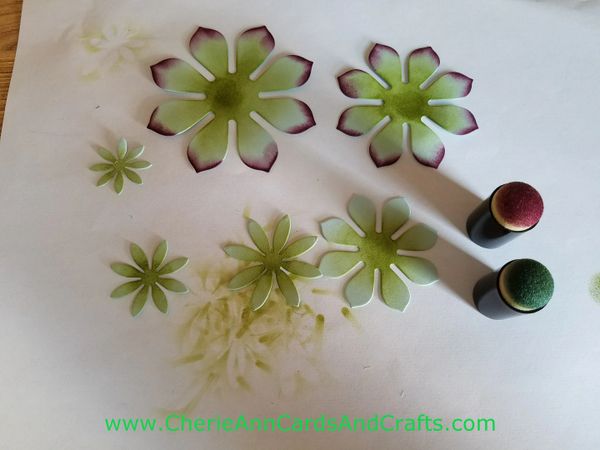 Cut out image using "thinlits". Sponge middle of each leaf with green ink using a dauber. Sponge the outside of each leaf with purple ink.